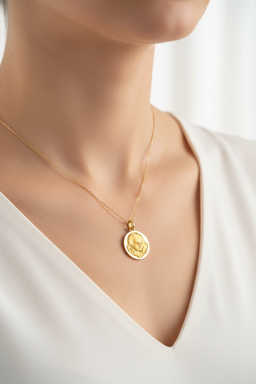 Esta medalla representa a un ángel con rostro travieso y alegre, que simboliza la ligereza, la inocencia y la alegría de vivir. Este ángel juguetón nos recuerda que la protección divina también puede expresarse con dulzura y humor, aportando un soplo de aire fresco y optimismo. Es una joya llena de ternura, perfecta para regalar a los niños o para celebrar la sencillez de la felicidad.