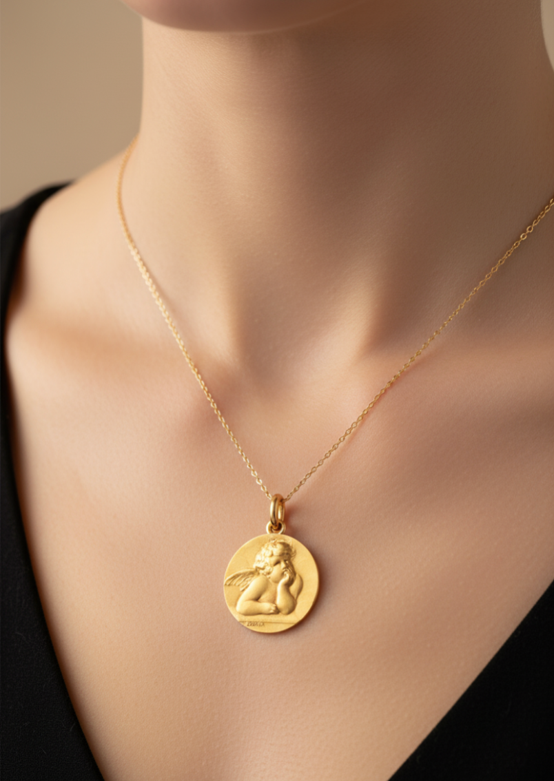 Esta medalla representa al Arcángel Rafael, reconocido en la tradición cristiana como el "sanador divino" y protector de los viajeros. Portador de luz y sabiduría, Rafael simboliza la guía celestial, la protección contra peligros físicos y espirituales, y la sanación interior. Este diseño se elige a menudo para acompañar momentos de transición, viajes o dificultades, ofreciendo una presencia reconfortante y una intercesión benévola.