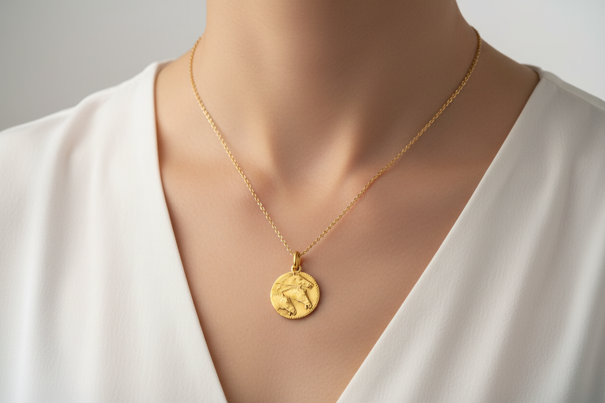 Este medallón está inspirado en el sello tradicional griego, símbolo de eternidad, armonía y protección. Su motivo geométrico en espiral o cruz evoca el equilibrio entre lo espiritual y lo material, así como la continuidad de la vida. Aportando fuerza y sabiduría ancestral, este medallón invita a la serenidad y a una profunda conexión con las raíces culturales mediterráneas.