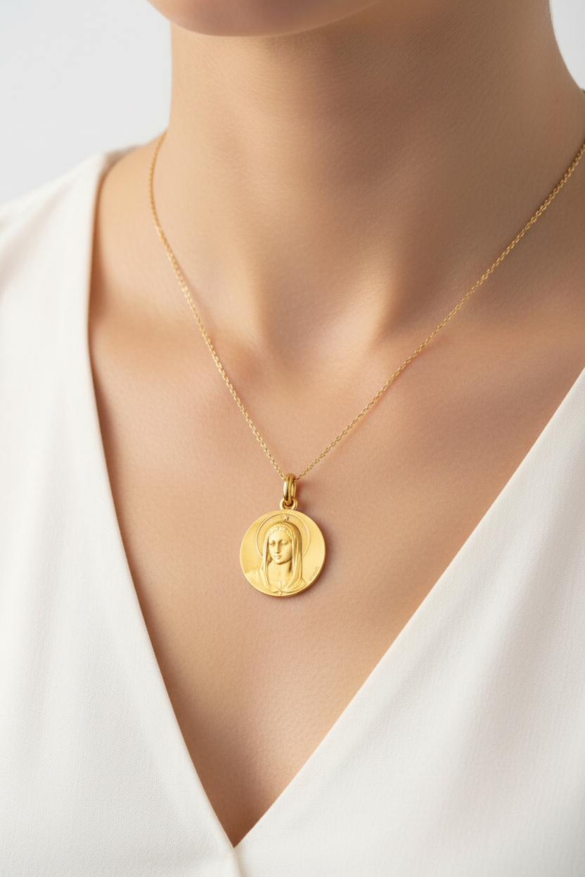 Medalla Becker Maris Stella en oro de 18 quilates, elaborada por la Maison Becker. Inspirada en el título latino "Estrella del Mar", esta medalla representa a la Virgen María como guía y protectora de los viajeros.