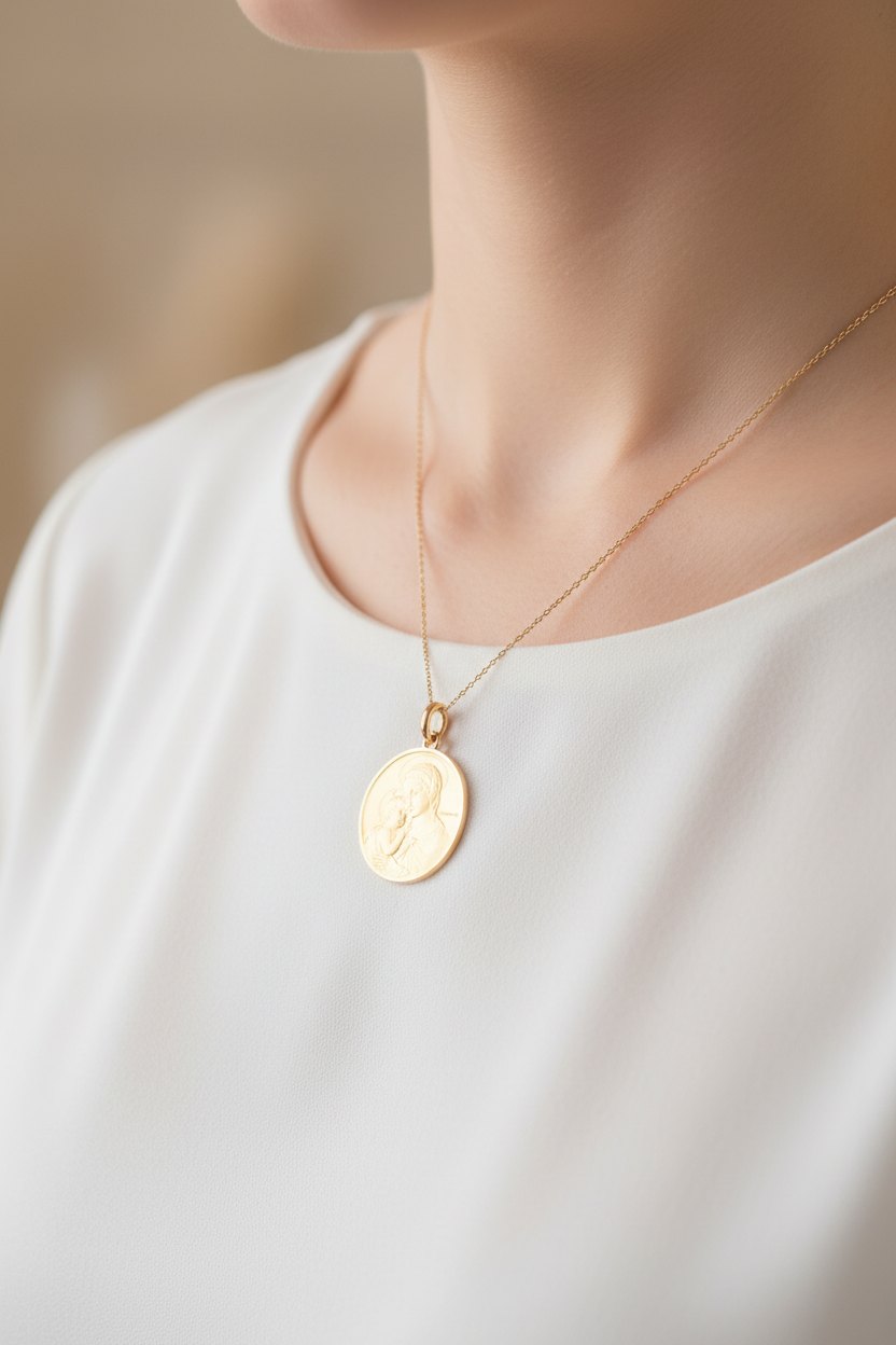 Esta medalla está inspirada en las obras del famoso pintor florentino Sandro Botticelli, reconocido por sus elegantes y delicadas representaciones de la Virgen María. Refleja la refinada belleza y la dulzura maternal del Renacimiento italiano, fusionando arte y espiritualidad. Esta medalla celebra tanto el legado artístico como la profunda devoción mariana, ofreciendo una joya impregnada de historia y emoción.